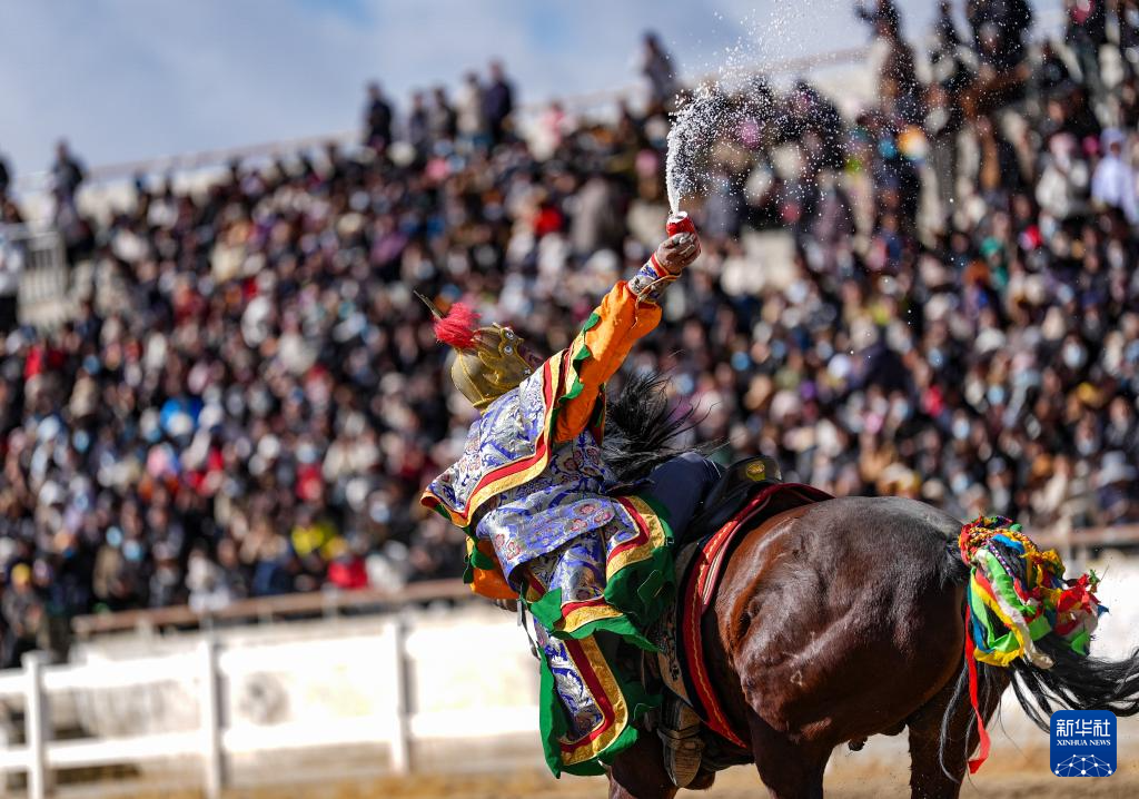 當(dāng)日,2025年藏歷新年初三民族傳統(tǒng)馬術(shù)表演暨民族賽馬活動在拉薩市北郊賽馬場舉行。馬術(shù)在西藏是吉祥、勇敢和智慧的象征。騎手們用精彩表演為觀眾送上新年的祝福。?