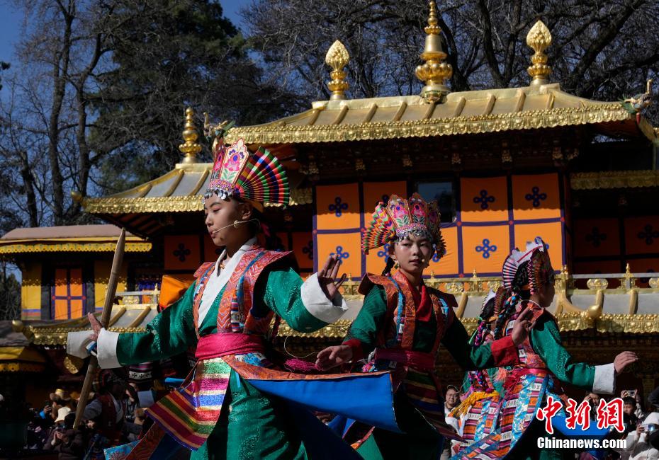 2月28日是2025年藏歷木蛇新年的第一天,市民游客在拉薩市羅布林卡內(nèi)吃切瑪、寫對聯(lián)、看藏戲,歡度藏歷木蛇新年。圖為少兒藏戲《朗薩雯波》演出現(xiàn)場。中新社記者 李林 攝