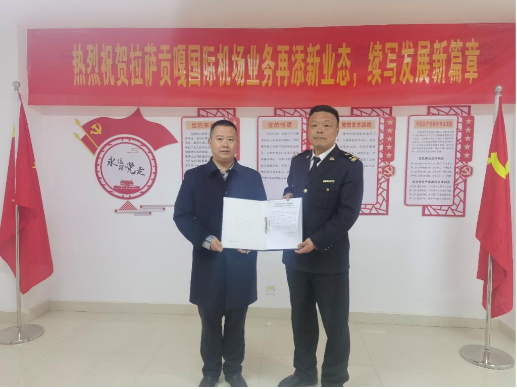 3日,拉薩海關(guān)負(fù)責(zé)人向西藏機(jī)場集團(tuán)貨運(yùn)部負(fù)責(zé)人頒發(fā)海關(guān)監(jiān)管貨物倉儲(chǔ)企業(yè)注冊(cè)登記證書。(拉薩海關(guān)供圖)