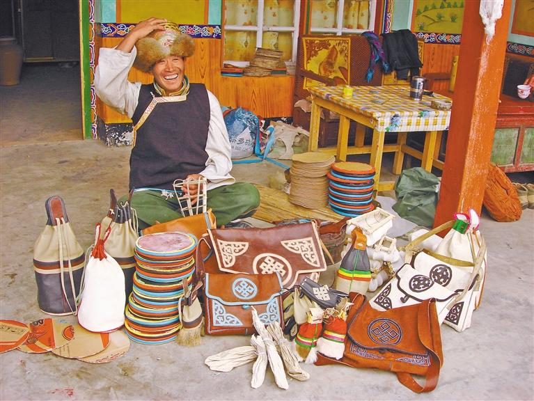 手藝人展示縣級非物質(zhì)文化遺產(chǎn)俊巴皮雕作品 。