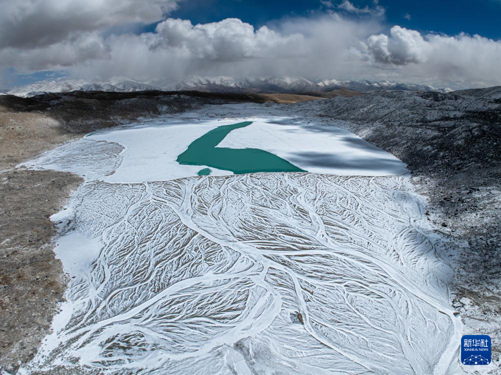 4月13日拍攝的普拉喜瓊峰腳下的曲隆嘎木措冰川湖(無人機照片)。新華社發(fā)(董志雄攝)