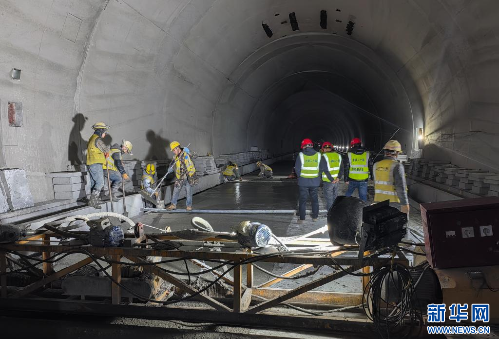 5月3日,工人們在然烏隧道進行混凝土路面整平工作。劉強 攝