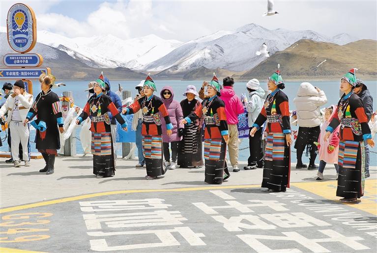 游客在羊卓雍錯景區(qū)欣賞特色民族歌舞表演。記者 丹增平措 攝