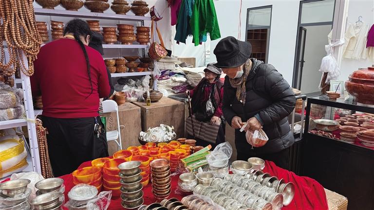 參展商們也在最后一天全力沖刺,來自不同地域、經(jīng)營不同品類商品的商家在展會上均收獲頗豐。來自尼泊爾的新白瑪塔西綜合商店老板拉魯,此次展銷會帶來了木碗、玉碗、銅碗等二十多類特色產(chǎn)品。他笑著表示:“銷量挺不錯的,我們家的產(chǎn)品不僅品類豐富,價(jià)格也實(shí)惠。這已經(jīng)是我第八次來拉薩參加展銷會了,每次都能感受到拉薩消費(fèi)者的熱情,也收獲滿滿?!?/p>