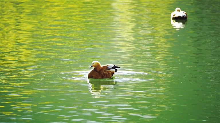 沿著蜿蜒的棧道,向濕地深處走去,清澈的湖水倒映著藍天、白云,仿佛置身于夢幻般的境界。天空中不時有鳥兒飛過,水中的赤麻鴨自由自在地游來游去,赤麻鴨寶寶排成“一”字隊形,緊隨媽媽身后。這里不僅是鳥類棲息的天堂,也是攝影愛好者最佳的觀鳥地。