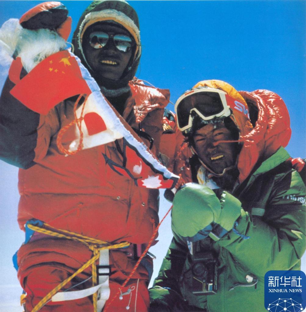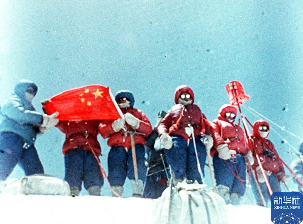 1975年5月27日,中國登山運動員索南羅布、羅則、侯生福、桑珠、大平措、貢嘎巴桑、次仁多吉、阿布飲、潘多從北坡登上珠峰。新華社發(fā)(侯生福 攝)