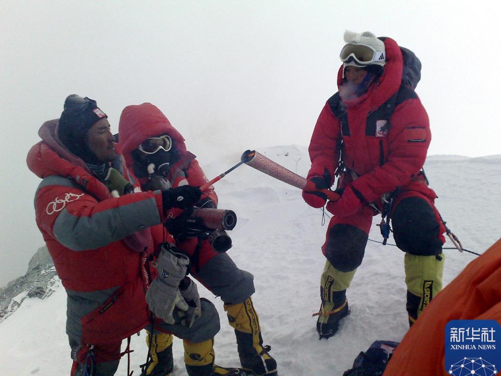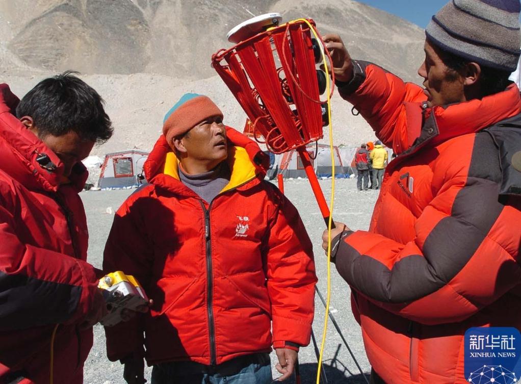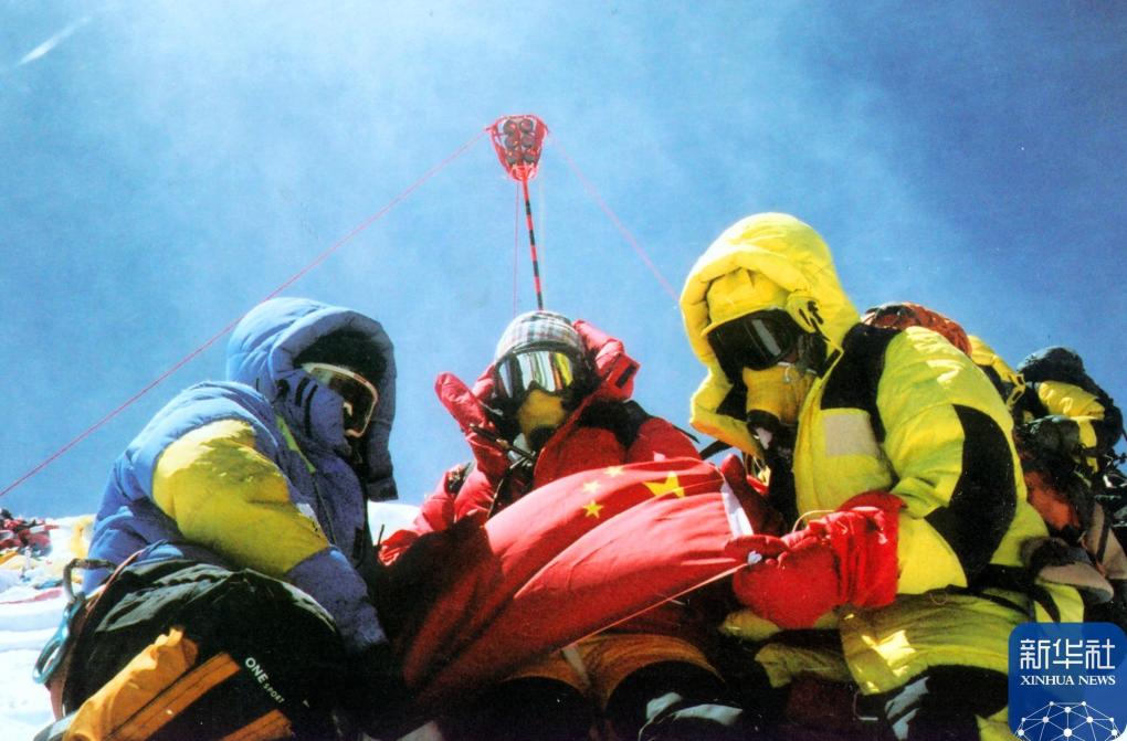 2005年5月22日,中國重測珠峰高度測量登山隊隊員在峰頂操作完設備后合影留念。新華社發(fā)