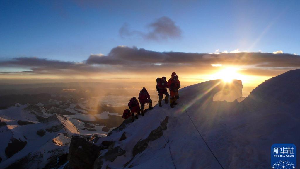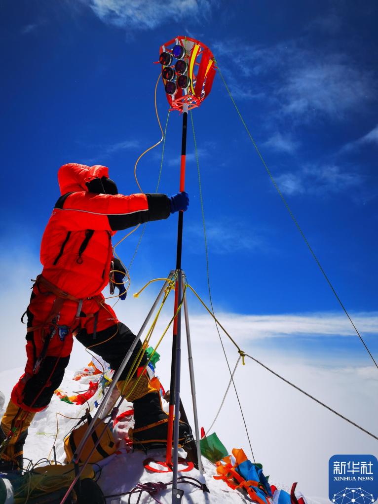 2020年5月27日,2020珠峰高程測量登山隊隊員在珠峰峰頂開展測量工作。新華社特約記者 扎西次仁 攝