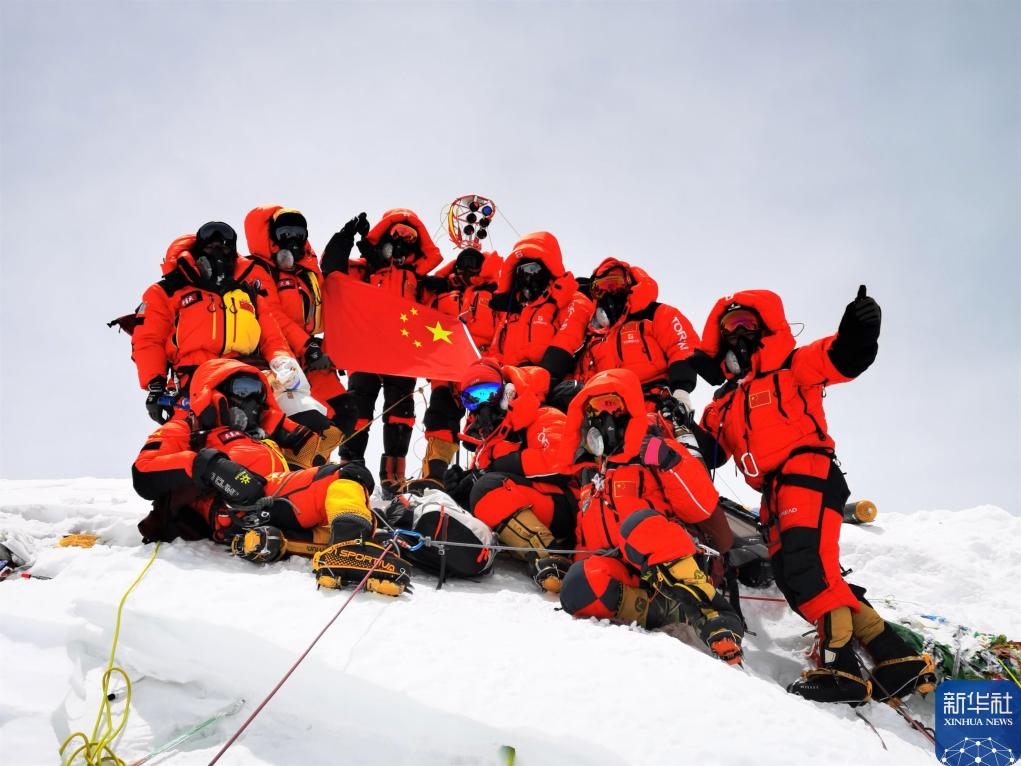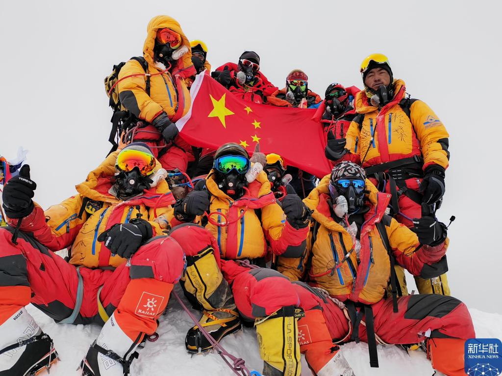 2020年5月27日,2020珠峰高程測量登山隊隊員在峰頂合影留念。新華社特約記者 扎西次仁 攝