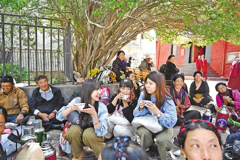 日本游客與當?shù)厝罕娨黄鹌穱L青稞酒。
