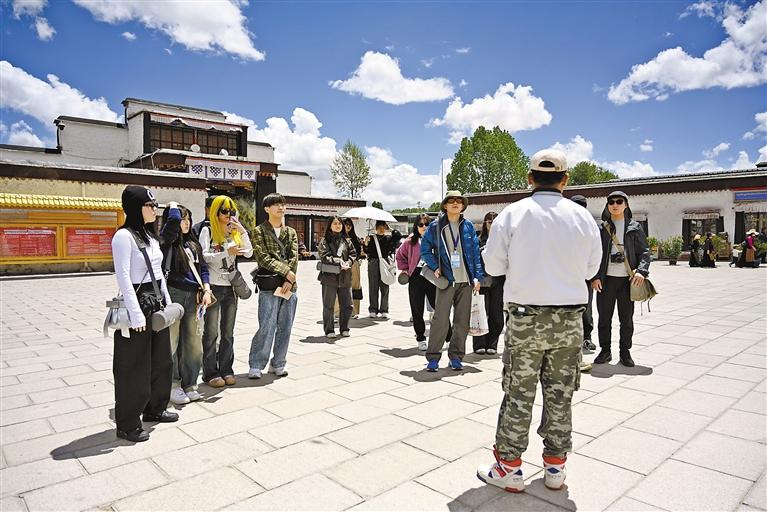 導游在為游客講解扎什倫布寺相關情況。