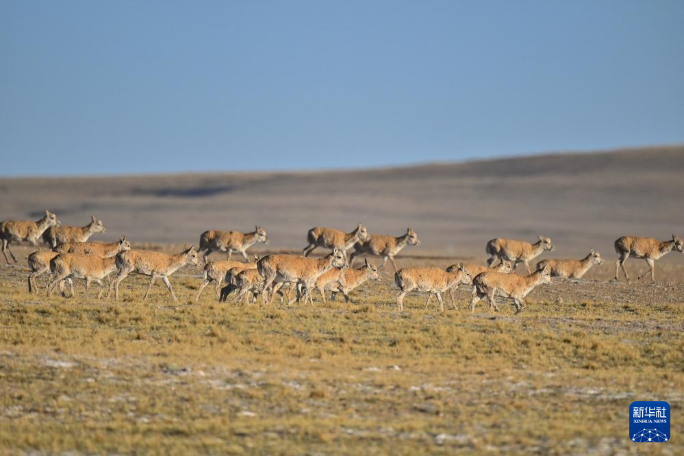 在羌塘國(guó)家級(jí)自然保護(hù)區(qū)核心區(qū)拍攝的遷徙中的雌藏羚羊群(6月9日攝)。新華社記者 旦增尼瑪曲珠 攝 ??