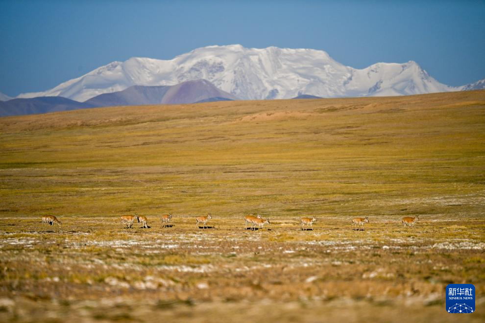 在羌塘國(guó)家級(jí)自然保護(hù)區(qū)核心區(qū)拍攝到的雄性和亞成體雌性藏羚羊(6月9日攝)。新華社記者 旦增尼瑪曲珠 攝 ??
