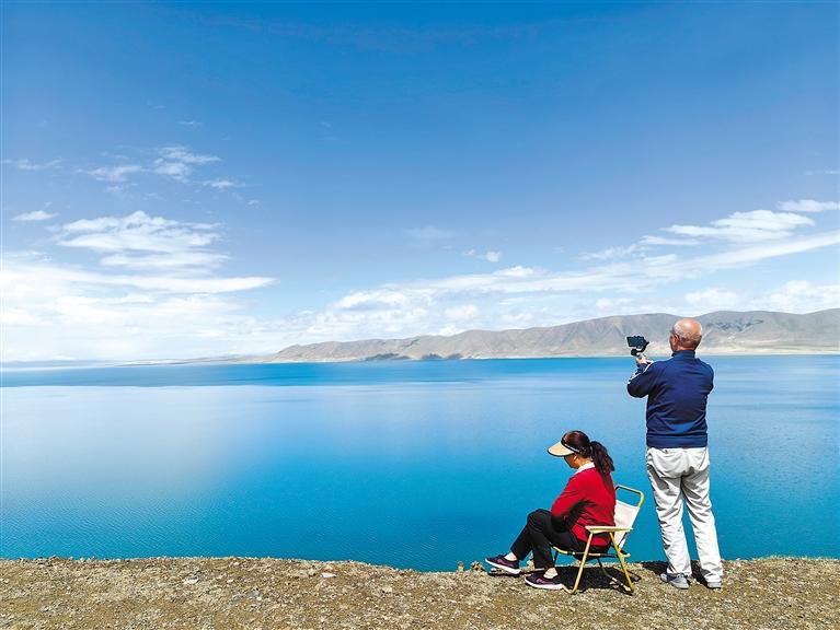 圖為游客在班戈縣巴木錯(cuò)觀賞風(fēng)光。記者 趙書(shū)彬 汪純 攝