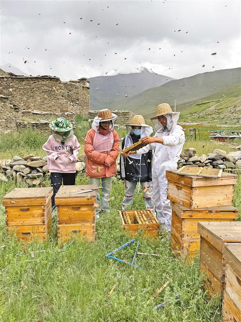 “蜂”產(chǎn)業(yè)激活鄉(xiāng)村振興“甜蜜動(dòng)能”。走進(jìn)卡珠村的德康瓦蜜蜂養(yǎng)殖專(zhuān)業(yè)合作社養(yǎng)殖基地,一排排蜂箱整齊擺放,成群的蜜蜂穿梭在花叢間,振翅的嗡嗡聲交織成一曲熱鬧的豐收曲。負(fù)責(zé)人尼瑪桑旦,一位返鄉(xiāng)創(chuàng)業(yè)的95后大學(xué)生,正帶領(lǐng)員工們忙碌著:“我們創(chuàng)立了‘阿媽準(zhǔn)’藏蜜品牌,也在銷(xiāo)售風(fēng)干牛肉、人參果、蕁麻草等特色產(chǎn)品,通過(guò)電商平臺(tái),我們的‘哲古味’已經(jīng)賣(mài)到了全國(guó)。去年銷(xiāo)售額突破了115萬(wàn)元,還帶動(dòng)了周邊10多戶(hù)群眾增收致富?!边@間小小的加工坊,正是哲古鎮(zhèn)推動(dòng)傳統(tǒng)產(chǎn)業(yè)與現(xiàn)代市場(chǎng)接軌的生動(dòng)縮影。