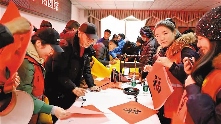 加查縣新時代文明實(shí)踐中心開展“鬧元宵 話團(tuán)結(jié)”活動,志愿者們與群眾一同用毛筆書寫美好寄語。