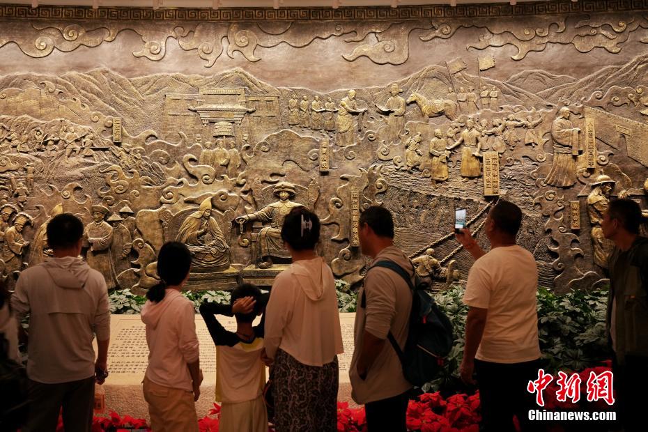 7月15日,在位于西藏拉薩的西藏博物館,觀眾參觀西藏歷史畫卷浮雕。據(jù)了解,西藏博物館設(shè)有基本陳列《雪域長歌—西藏歷史文化展》《離太陽最近的人—西藏民俗文化展》,充分展示西藏地區(qū)歷史發(fā)展進程與文化面貌。中新社記者 張祥毅 攝