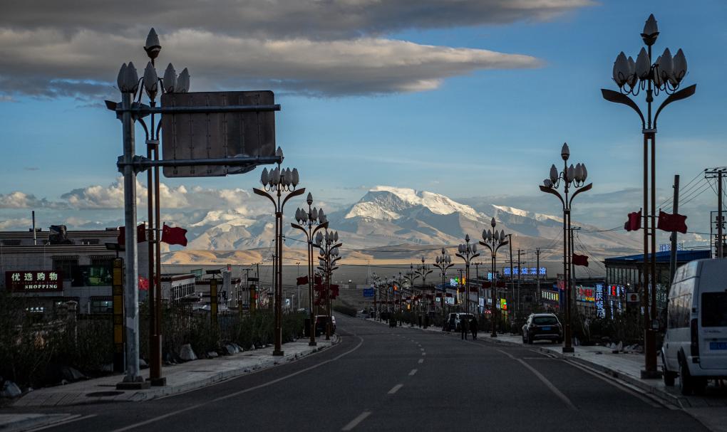 塔爾欽小鎮(zhèn)中心街道南望,可見終年積雪的納木那尼峰。新華社記者 丁增尼達 攝