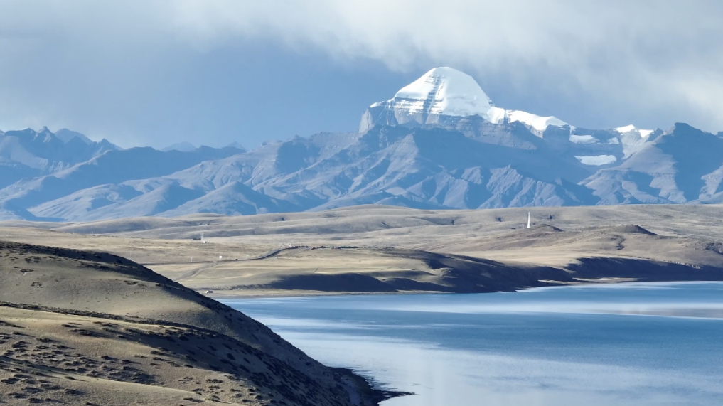 瑪旁雍錯湖畔遠眺,岡仁波齊靜立天際。新華社記者 黃智琪 攝
