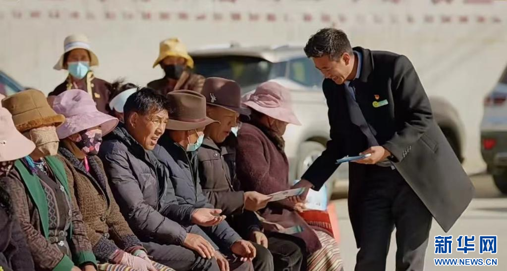 ??工作人員阿旺旦增為扎洞村群眾宣講金融知識(shí),并介紹“庭院經(jīng)濟(jì)貸”相關(guān)業(yè)務(wù)。(中國(guó)農(nóng)業(yè)銀行股份有限公司山南分行供圖)