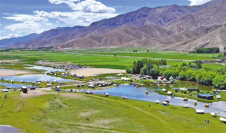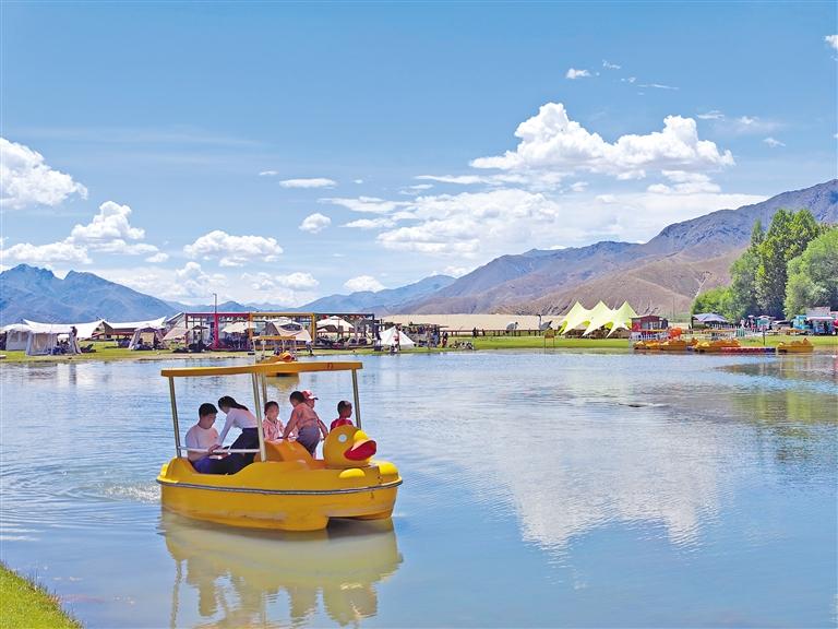 楚貴林卡位于日喀則市桑珠孜區(qū)東嘎鄉(xiāng)楚貴村。2019年初,青島援藏組規(guī)劃盤活村集體用地,打造以自然生態(tài)景觀、休閑度假旅游及異域農(nóng)耕民俗文化體驗為主題,融合當(dāng)?shù)匚幕瘍?nèi)涵的“楚貴村生態(tài)旅游度假區(qū)”項目。項目自2022年啟動以來,隨著運營漸趨成熟,林卡休閑游樂設(shè)施逐年豐富。如今,這里設(shè)有咖啡休閑館、山地摩托、真人CS、游船、騎馬等多個傳統(tǒng)與現(xiàn)代結(jié)合的項目,受到游客青睞。