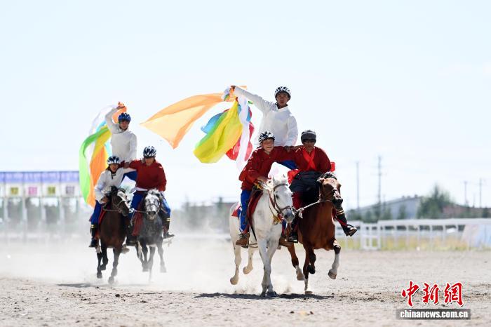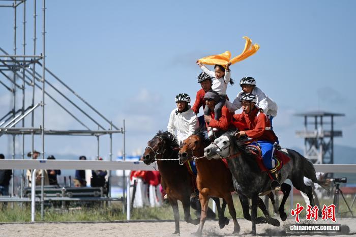 8月13日,九色甘南香巴拉·瑪曲第十六屆格薩爾賽馬會(huì)在甘肅甘南藏族自治州瑪曲縣格薩爾賽馬中心開幕。來自貴州、西藏、青海、四川、甘肅等省區(qū)的45支參賽隊(duì)962匹駿馬在瑪曲草原上展開為期5天的角逐。圖為開幕式現(xiàn)場馬術(shù)表演。中新社記者 九美旦增 攝