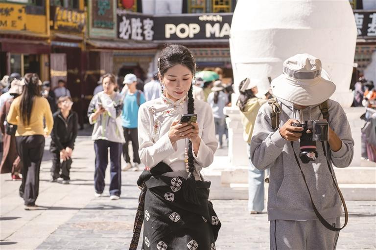 街巷里,來自五湖四海的游客們開始穿梭在八廓街蜿蜒曲折的街巷中。他們滿懷好奇,感受著這里獨特的風(fēng)土人情。不少游客興致勃勃地穿上一套精美的藏裝,搖身一變成為高原上美麗的“卓瑪”與帥氣的“扎西”。他們在古街的每一個角落留下自己的身影,臉上洋溢著對這片土地的喜愛與贊嘆。