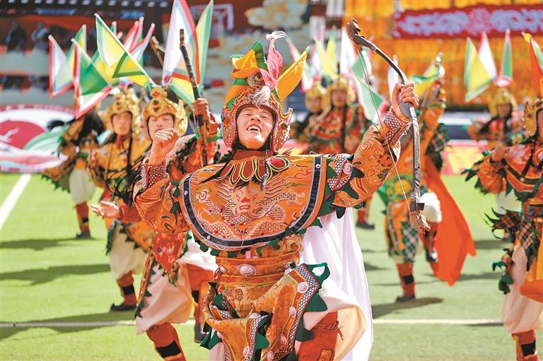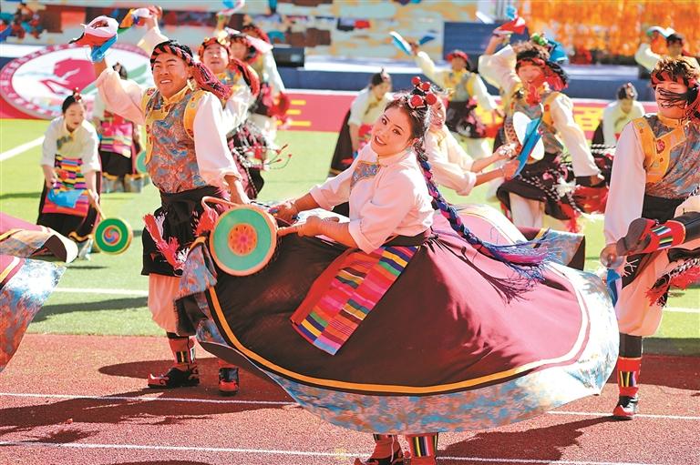 9月15日舉行的第十一屆三江茶馬文化藝術節(jié)開幕式上,來自昌都11個縣(區(qū))的群眾代表組成游行方隊,載歌載舞,繞場一周,熱烈激昂的丁青熱巴、豪邁威武的類烏齊嶺卓舞、優(yōu)美歡快的芒康弦子等非遺舞蹈,向現(xiàn)場的干部群眾和各界來賓展示了昌都獨特的傳統(tǒng)文化和熱情好客的真摯情誼。隨后的文藝表演以歌舞和情景劇的形式,從金沙江的紅色記憶,到怒江的文化傳承,再到瀾滄江的高質(zhì)量發(fā)展之光,描摹出了昌都歷史文化的主要脈絡和經(jīng)濟社會發(fā)展取得的巨大成就,為現(xiàn)場觀眾奉獻了一場難忘的文藝盛宴。