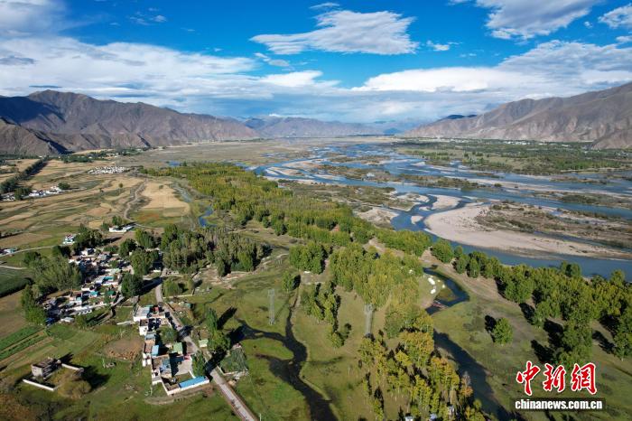9月20日,拉薩河畔神秘樹林風(fēng)光,據(jù)悉該樹林以前為荒灘。(無人機(jī)畫面)中新社記者 江飛波 攝