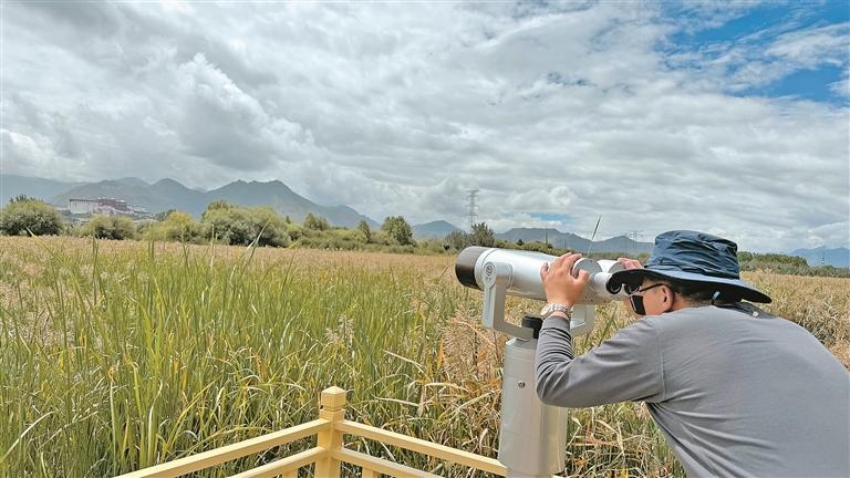 市民在拉魯濕地公園內(nèi)通過(guò)望遠(yuǎn)鏡觀賞布達(dá)拉宮。