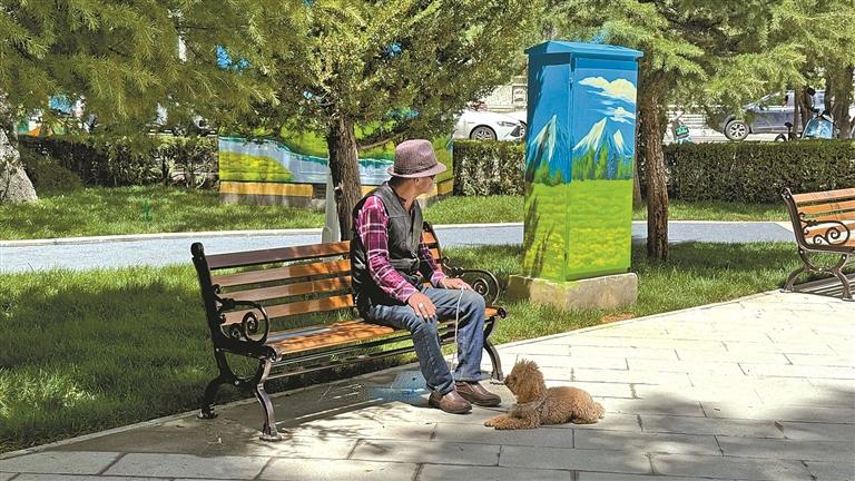 拉薩和諧公園內(nèi)老人攜寵物狗休憩。