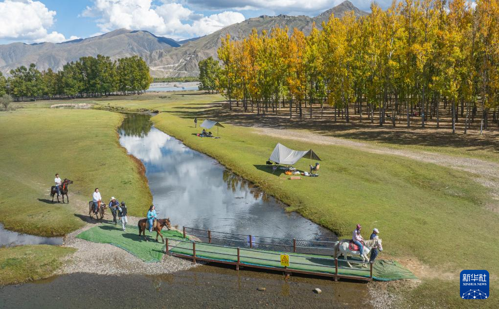 游客們?cè)诶_市林周縣“神秘樹林”林卡營(yíng)地體驗(yàn)騎馬(9月27日攝,無人機(jī)照片)。新華社記者 丁增尼達(dá) 攝??