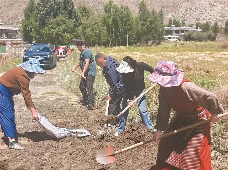 圖為山南市商務(wù)局駐村工作隊隊員和村民一起修整田間道路,方便人員和車輛通行。