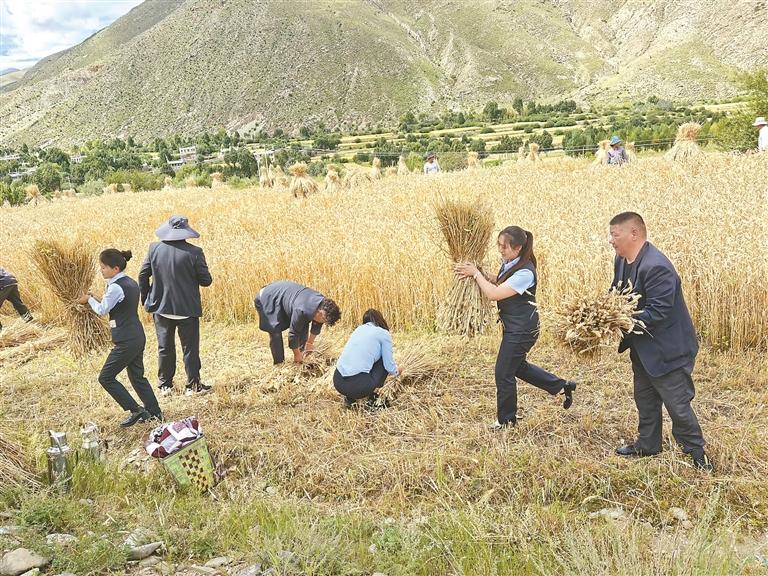 圖為農(nóng)行山南分行“格桑花”金融服務(wù)隊隊員幫助群眾收割青稞。