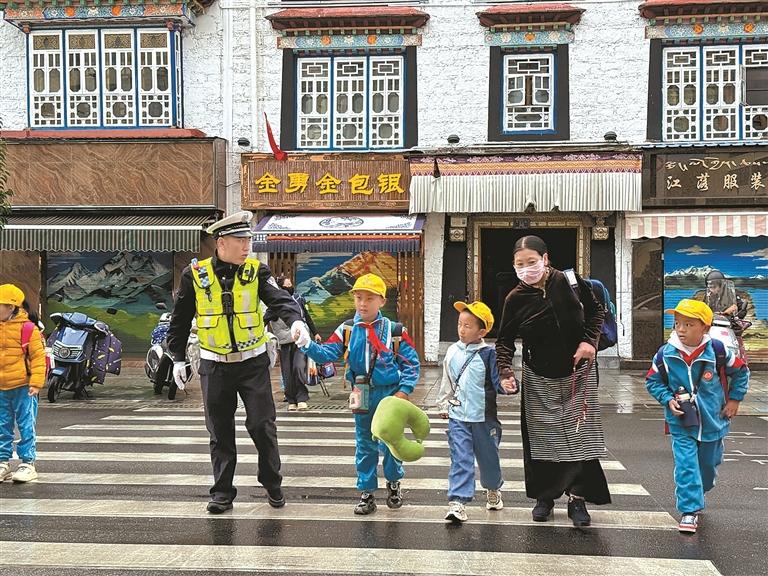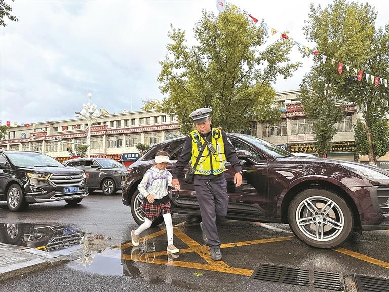 圖為拉薩市公安局交通管理支隊民警幫助獨行的學生穿過車流。記者 鹿麗娟 攝