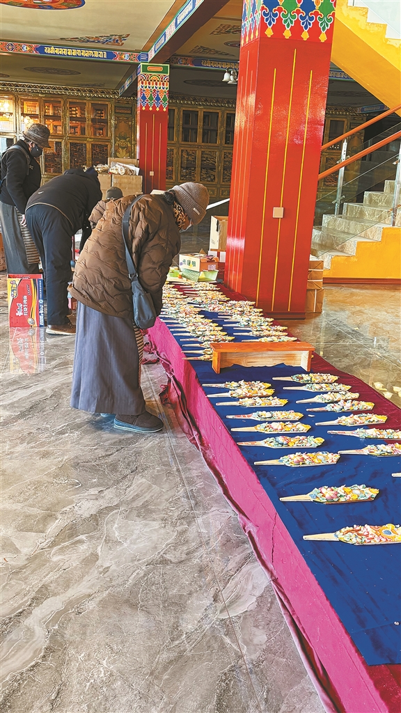 來到店內(nèi),一排排酥油花整齊陳列,蓮花、祥云、鯉魚等傳統(tǒng)圖案栩栩如生,細(xì)節(jié)精致,引得顧客頻頻駐足。上午10時許,已有不少市民慕名而來——有的通過社交平臺刷到,有的則是親友口口相傳的老顧客?!昂芏嗳嗣磕甓紩崆邦A(yù)訂。”店鋪負(fù)責(zé)人達(dá)瓦堅贊自豪地介紹,自從在社交網(wǎng)絡(luò)上宣傳后,訂單激增,制作酥油花的師傅們每天從早忙到晚,仍供不應(yīng)求。