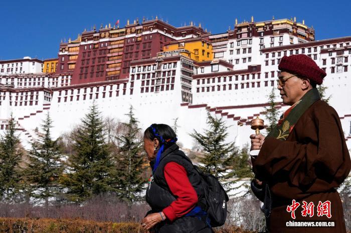 1月23日,西藏拉薩布達(dá)拉宮腳下,信眾手持轉(zhuǎn)經(jīng)筒轉(zhuǎn)經(jīng)。冬季高原進(jìn)入農(nóng)閑期,眾多藏傳佛教信眾從各地來(lái)到拉薩,沿布達(dá)拉宮、大昭寺等地轉(zhuǎn)經(jīng)、朝拜、祈福。中新社記者 李林 攝