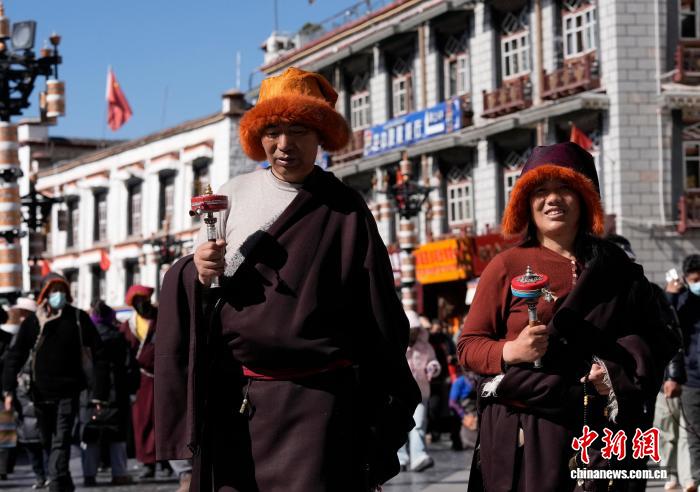 1月23日,西藏拉薩八廓街,信眾手持轉(zhuǎn)經(jīng)筒轉(zhuǎn)經(jīng)。冬季高原進(jìn)入農(nóng)閑期,眾多藏傳佛教信眾從各地來(lái)到拉薩,沿布達(dá)拉宮、大昭寺等地轉(zhuǎn)經(jīng)、朝拜、祈福。中新社記者 李林 攝