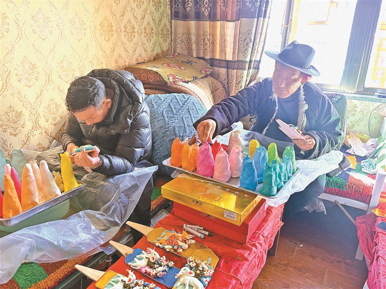 圖為羅布(右)和徒弟一起制作酥油花。 通訊員 多吉卓瑪 旦增尼瑪 攝