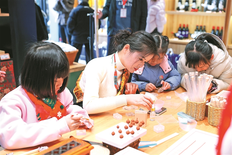 在“藏文化體驗區(qū)”,藏香咨詢師劉曉靜(中)在指導孩子們制作藏香手串。記者 周婷婷 攝