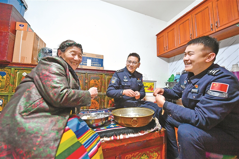 “本來(lái)想著今年回不了家,心里空落落的,沒(méi)想到在石曲哥家過(guò)上了這么熱鬧的‘古突’夜,也算是吃上了年夜飯?!比ツ陝倕⒓庸ぷ鞯哪贻p民警徐若吃到一塊象征“吉祥”的面疙瘩,眼眶微熱。次仁卓瑪又為他添上一勺湯:“我們是一家人,這里就是家?!?/p>