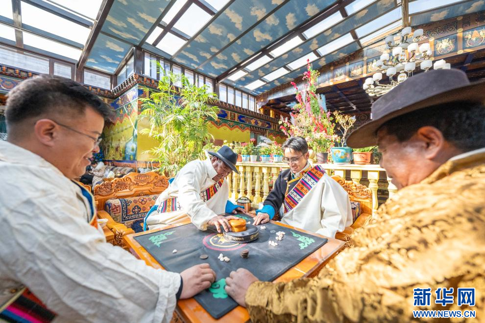 1月20日,西藏日喀則市桑珠孜區(qū)聶日雄鄉(xiāng)楚松村村民多吉旺堆(左二)和家人在玩骰子。新華網(wǎng) 旦增努布 攝