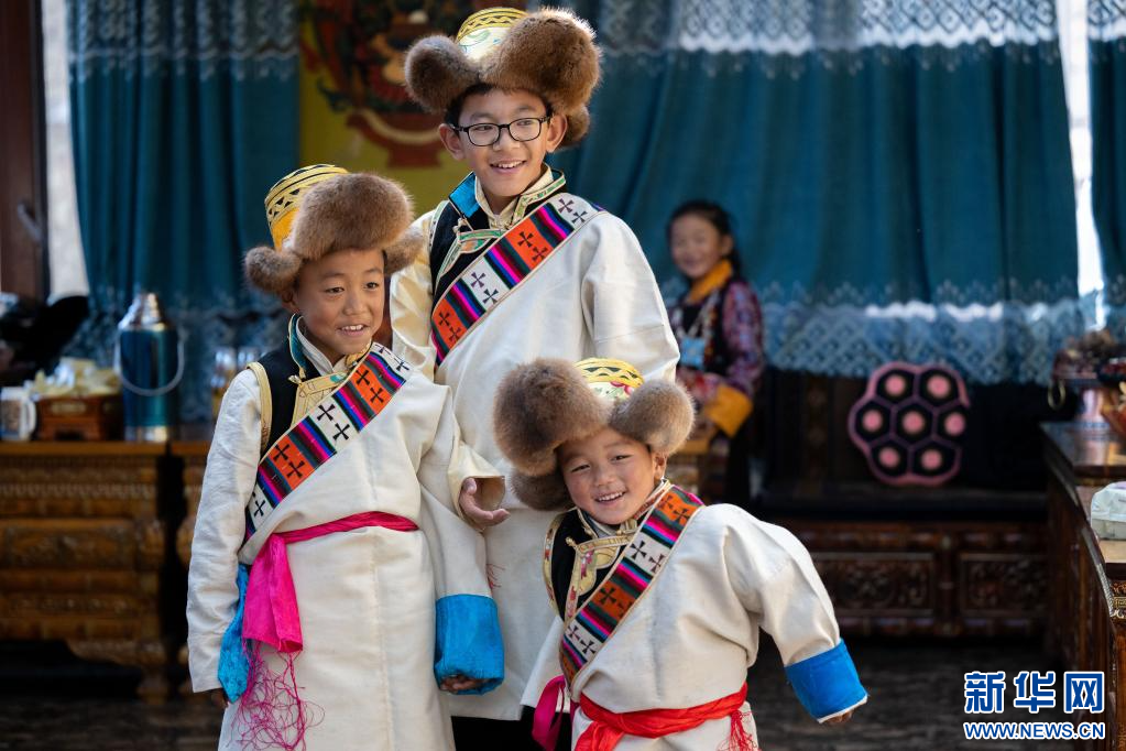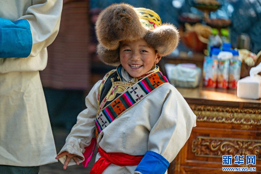 1月20日,西藏日喀則市桑珠孜區(qū)聶日雄鄉(xiāng)楚松村村民多吉旺堆家穿上盛裝的小朋友。新華網(wǎng) 旦增努布 攝