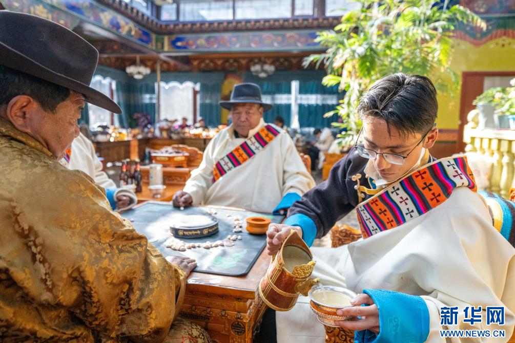 1月20日,西藏日喀則市桑珠孜區(qū)聶日雄鄉(xiāng)楚松村村民多吉旺堆家的晚輩在給長輩敬青稞酒。新華網(wǎng) 旦增努布 攝