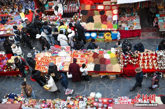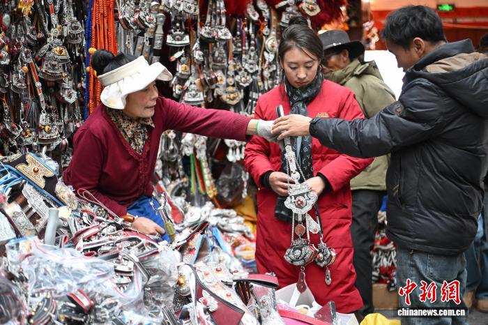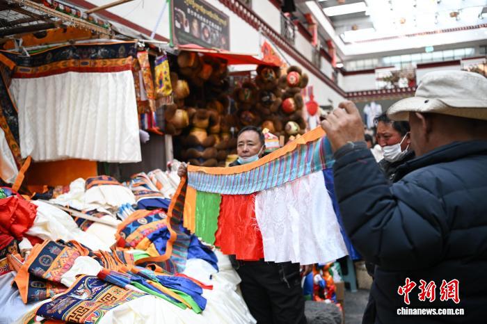 圖為市民在八廓商城選購年貨香布(藏式建筑門窗上裝飾的五彩布料)。中新社記者 貢嘎來松 攝