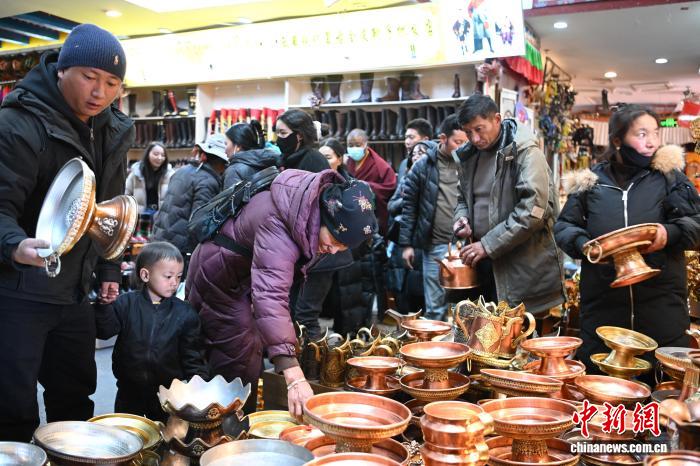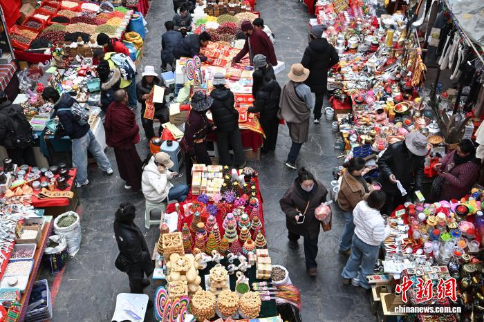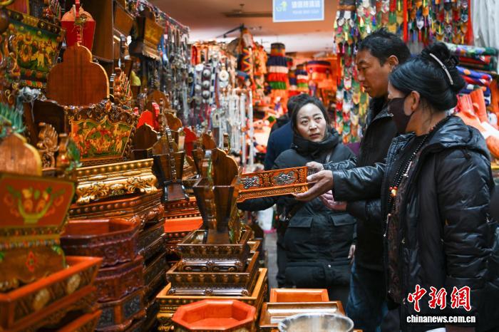 2月9日,隨著春節(jié)、藏歷新年臨近,西藏拉薩市八廓商城等年貨市場人頭攢動。市民忙著挑選酥油花、香布、切瑪盒等傳統(tǒng)年貨,市場內(nèi)購銷兩旺、喜慶熱鬧,古城拉薩處處洋溢著濃厚的節(jié)日氛圍。圖為市民在八廓商城選購年貨切瑪盒。中新社記者 貢嘎來松 攝