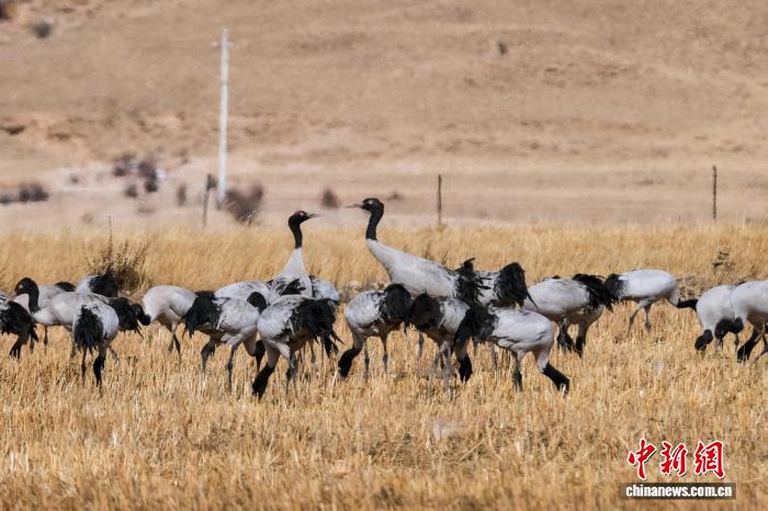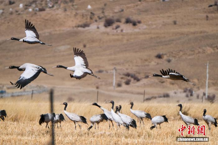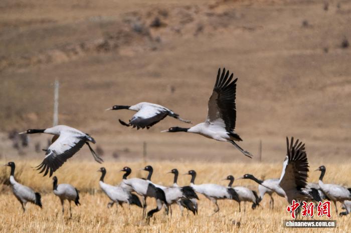 黑頸鶴是中國(guó)國(guó)家一級(jí)保護(hù)動(dòng)物,是唯一生活、繁殖在高原的鶴類,被藏族民眾譽(yù)為“吉祥鳥”。近日,西藏自治區(qū)拉薩市林周縣林業(yè)和草原局介紹,作為黑頸鶴重要的越冬棲息地,今年該縣境內(nèi)黑頸鶴數(shù)量在1800只至2300只之間,其中虎頭山水庫(kù)卡東村一帶占比約一半。中新網(wǎng)記者在周邊看到,不少黑頸鶴在田間覓食,不時(shí)飛翔于高原農(nóng)田、村落上空,舞動(dòng)的鶴影和聲聲鶴鳴為冬春時(shí)節(jié)的高原增添了幾分靈動(dòng)。圖為2月8日,黑頸鶴群在悠閑覓食。江飛波 攝
