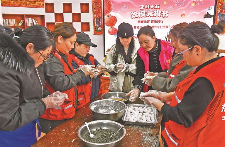 圖為拉薩市城關區(qū)吉崩崗街道熱木其社區(qū)群眾和社區(qū)工作人員正在包湯圓。記者 旦增蘭澤 攝