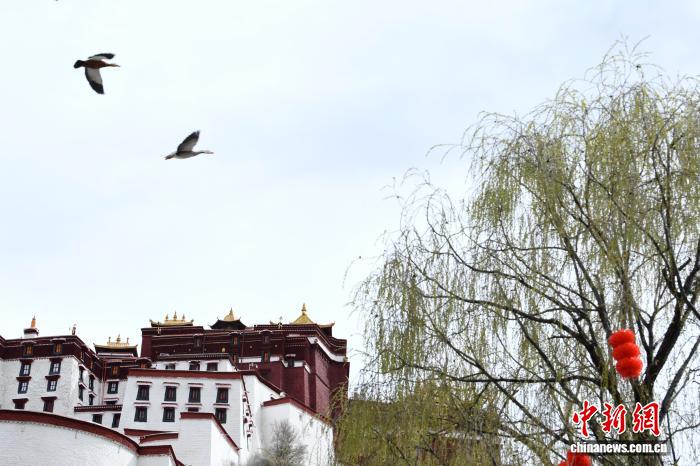 3月8日,西藏拉薩宗角祿康公園,楊柳吐綠。陽(yáng)春三月,古城拉薩桃花初放、生機(jī)盎然,春意漸濃。中新社記者 貢嘎來(lái)松 攝