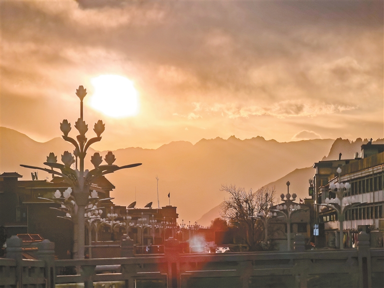 當(dāng)夕陽的最后一抹余暉染紅天際,拉薩迎來了一天中最動人的時(shí)刻。金色的霞光如同融化的金子,從山巒間緩緩傾瀉,為遠(yuǎn)處的山脊、城市的街道、錯落的建筑鍍上一層溫暖的光暈。暮色漸濃,煙火氣依舊綿長,這抹落日余暉,是一天忙碌生活的溫柔收尾,也是夜晚靜謐時(shí)光的溫柔序曲,讓“日光城”的黃昏,永遠(yuǎn)帶著治愈人心的力量,藏著說不盡的溫柔與美好。